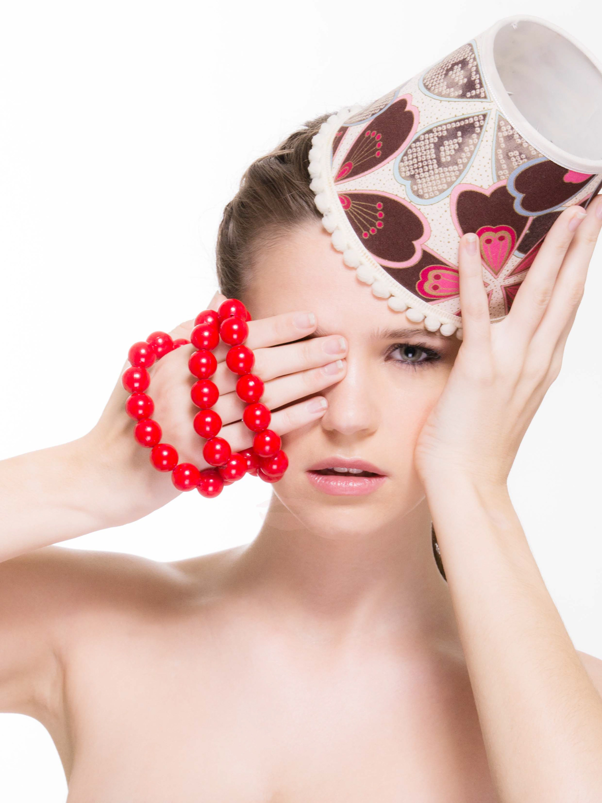 Trabajo con modelo profesional. Jugando con obejetos cotidianos transformados en accesorios de moda.